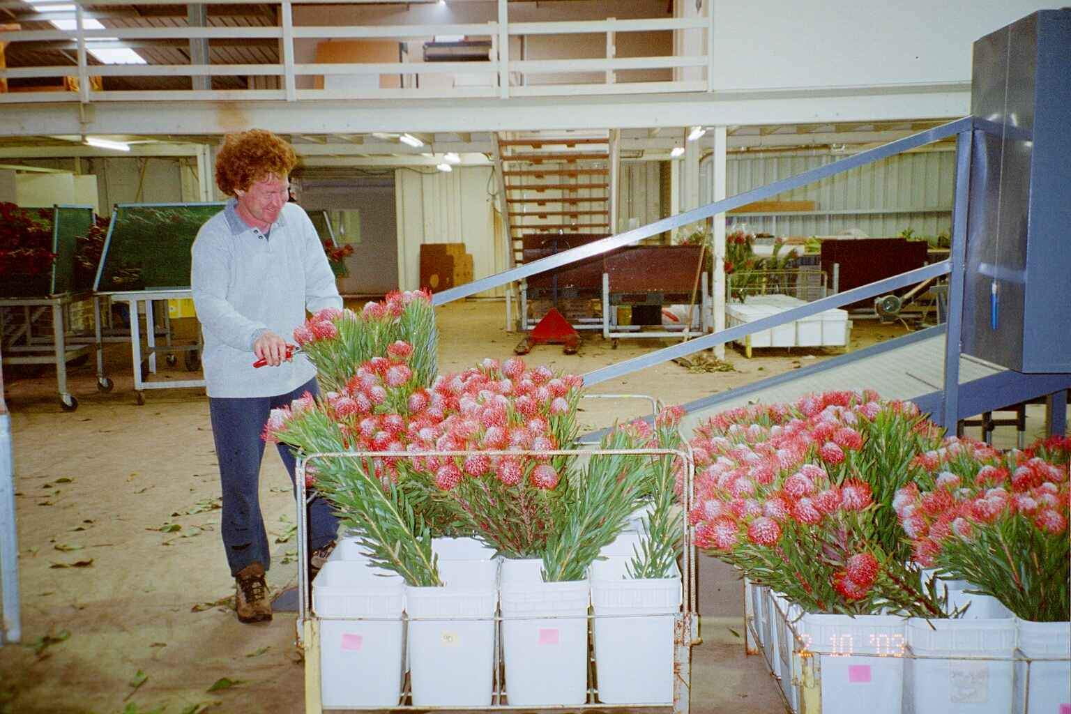 This older photo (check out the afro) shows our old dry harvesting hoppers on trolleys in the background - a very fast system for doing Leucadendrons in bulk. Recently we've been using water bucket racks, with added wheels to get them on and off the custom picking trailer, to cut flowers straight into water in the field. This is great for improving the vase life of proteas such as our king proteas.
